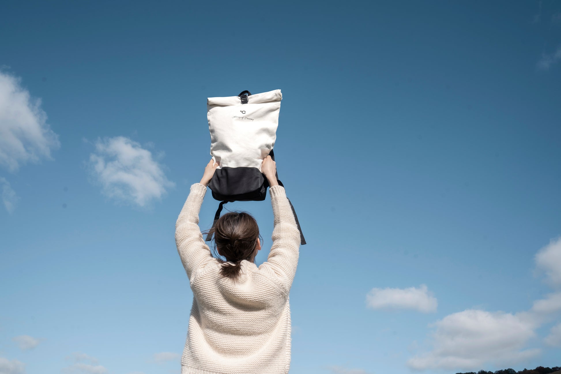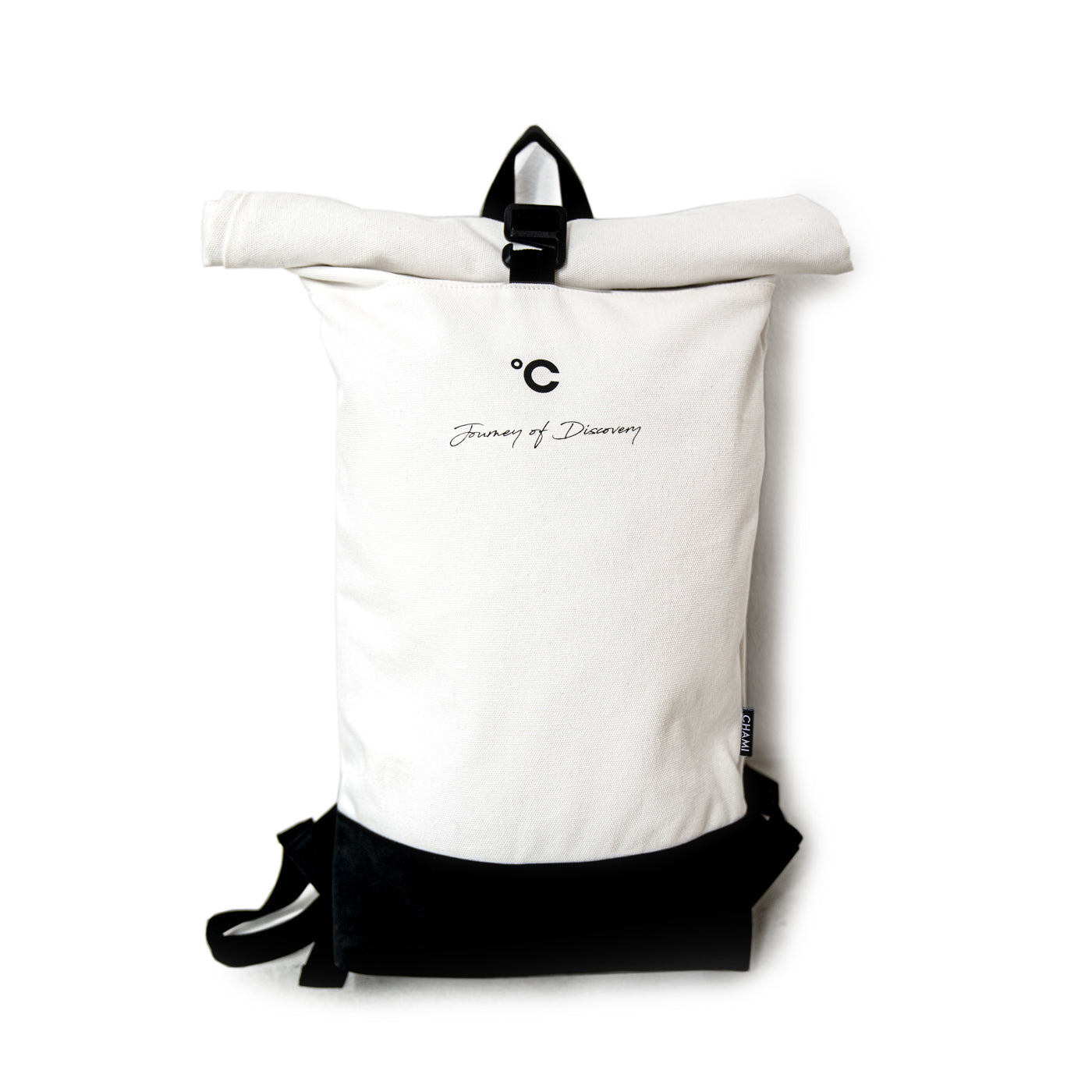 CHAMIのオリジナルバックパック。上のフックを開けての荷物の出し入れが可能。背中に当たる部分にもジッパー付きのポケットがあり、外からの出し入れができ便利です。