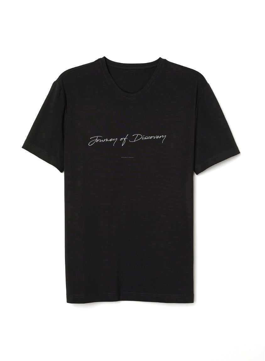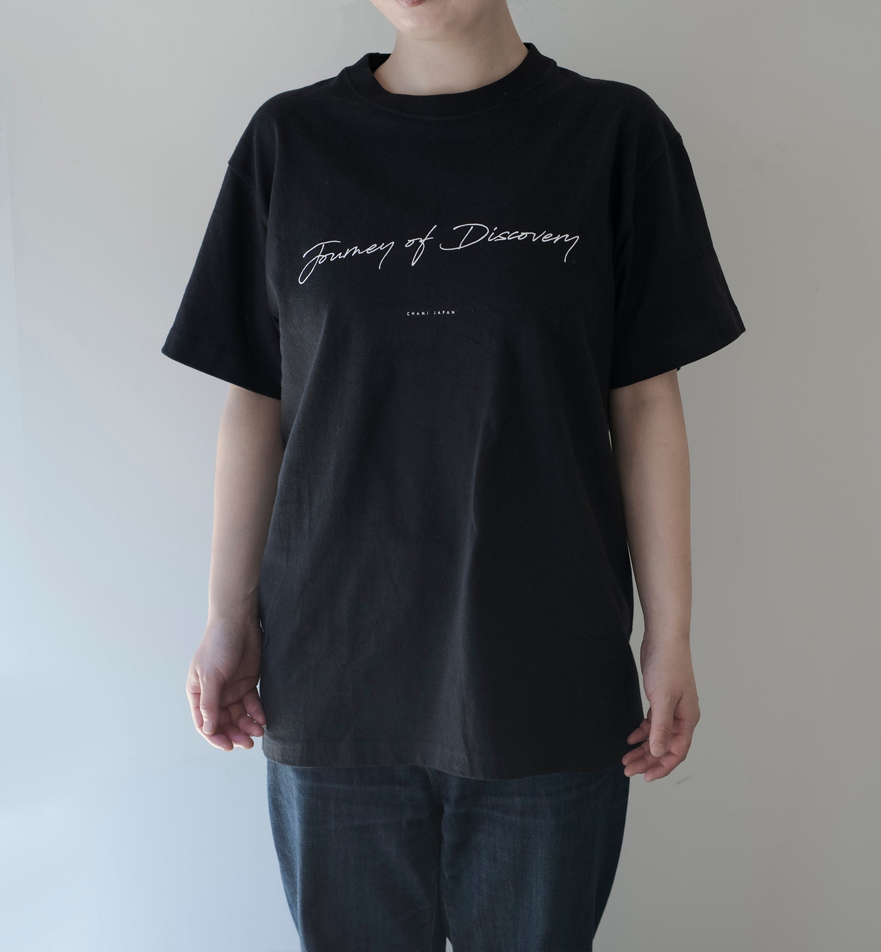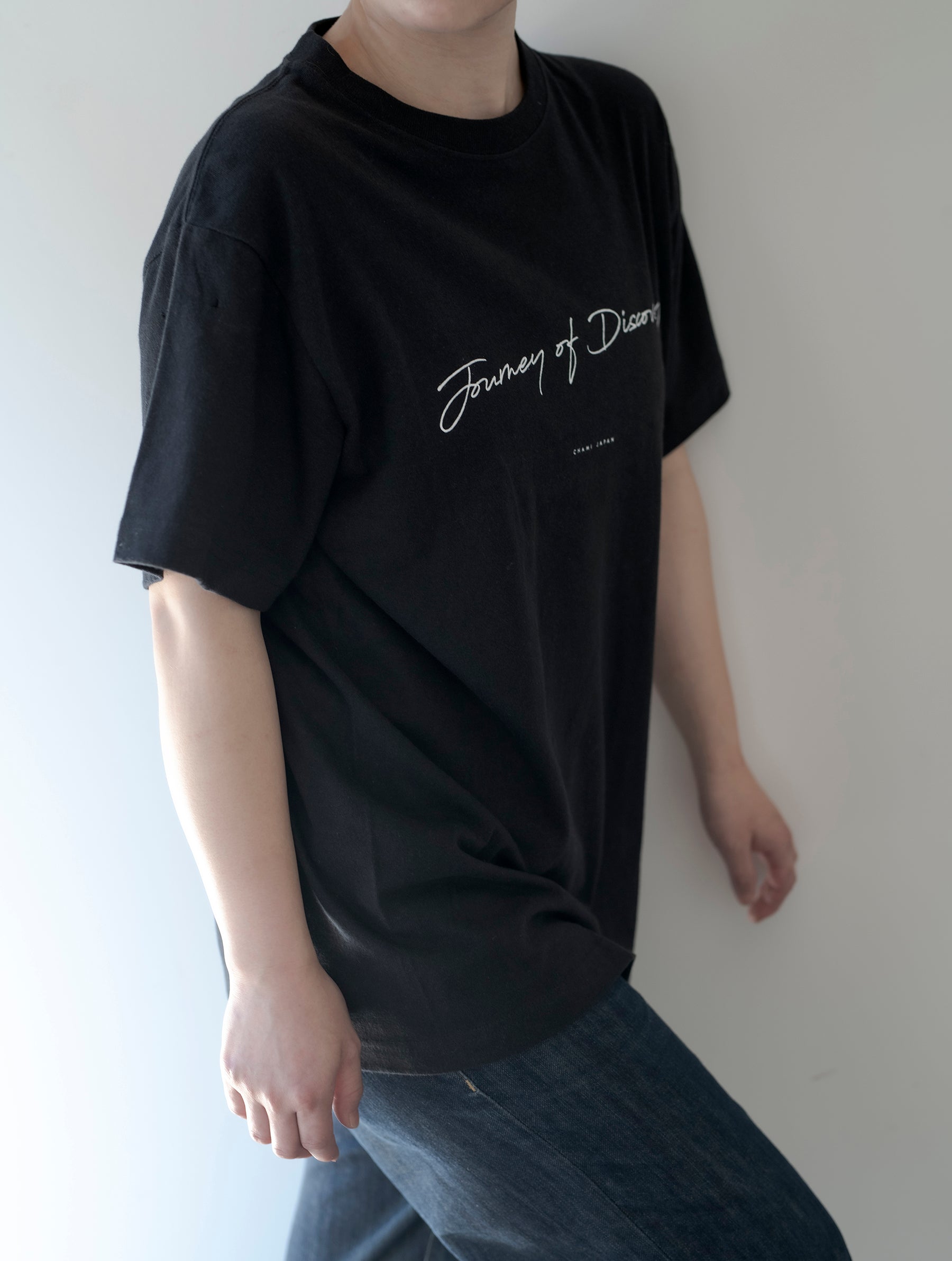 Journey of Discoveryの文字が胸部分に手描きのようにデザインがされたTシャツ。黒のTシャツはシックに着ていただけます。